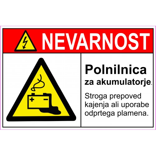 Varnostni/opozorilni znak/nalepka Pozor polnilnica za akumulatorje in prepoved kajenja je izdelana skladno z zahtevami Pravilnika o varnostnih znakih oz. standarda SIST 1013. Znak za Pozor polnilnica za akumulatorje in prepoved kajenja lahko naročite kot nalepko, tablo PVC ali ALU.