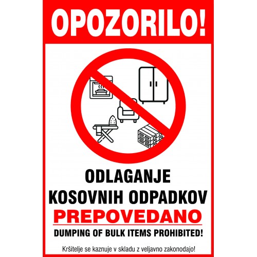 Znak za Prepovedano odlaganje kosovnih odpadkov lahko naročite kot nalepko, tablo PVC ali