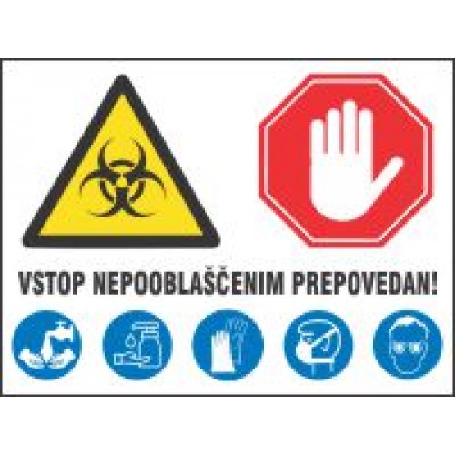 Varnostni/opozorilni znak/nalepka za prepovedano vstopanje nepooblaščenim osebam, kjer je obvezno si umiti in dezinficirati rok ter uporabljati masko, očala in rokavice je izdelana skladno z zahtevami Pravilnika o
